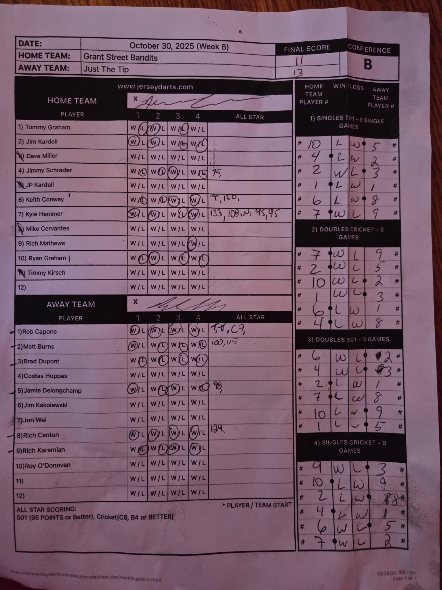 | Week 6 | Oct 30, 2025 | Just The Tip | @ | Grant Street Bandits | Grant Street Café | 13 @ 11 |   |   |